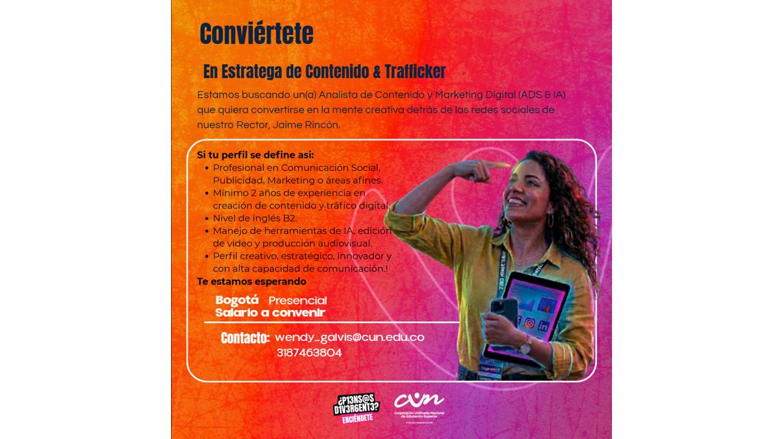 En la CUN creemos en las ideas que transforman. No somos una institución convencional y nuestra comunicación tampoco lo es. Por eso estamos buscando un(a) Estratega de Contenido & Trafficker que quiera convertirse en la mente creativa detrás de las redes sociales de nuestro Rector.
